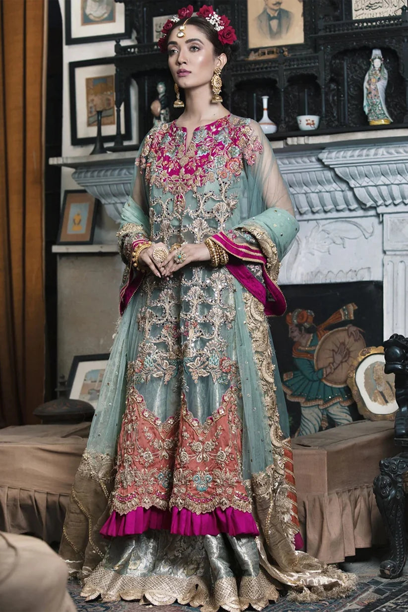 Add superior style to your marriage attire by wearing Aqua Bridal Ensemble. The modern wedding dress is beautifully crafted from aqua with brilliant pinkish-red and coral accents. With complete needlework and detailed manual work, it has been made carefully using elaborate methods such as zardozi, tilla, dabka, and naqshi, mirrors, and beads.