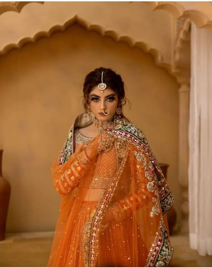 The vibrant Mustered Orange color is a rich, warm hue that complements all complexions and stands out beautifully. Both the Blouse and Lehenga are crafted from luxurious Pure Rawsilk, providing a gorgeous structure and texture that holds the elaborate work perfectly. The look is completed with a delicate, flowing Duputta on Pure Net.